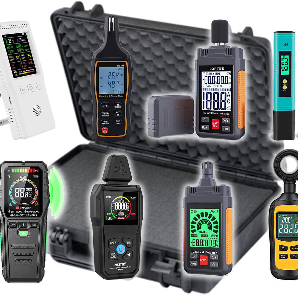 COME MIGLIORARE LA QUALITÀ DI VITA IN CASA\n\nLa casa ha sempre rivestito il ruolo di porto di approdo, nido dove ripararsi e rifugiarsi. Negli ultimi anni è però diventata il luogo per eccellenza dove sentirsi a proprio agio in qualsiasi momento della giornata, per noi i nostri cari, i nostri figli, ma anche il perdurare per alcune categorie lavorative, come lo smart-working.\n\nÈ così diventato ancora più fondamentale oltre l’arredamento che sia in modo funzionale e al nostro benessere e su misura della nostra personalità, avere anche dei giusti parametri su tutto quello che riguarda l’aria, l’acqua, l’umidità, le poveri, ecc. ma ci sono tanti strumenti e metodi per migliorare la qualità della vita in casa a 360 gradi.\n\nIl Kit Valigia che vi proponiamo, contiene una serie di strumenti per controllare l'ambiente domestico.\n\nStrumenti nel kit valiga:\n\n[Monitor qualità dell'aria] Un rilevatore equipaggiato per misurare temperatura, umidità, PM2.5, PM10, HCHO, TVOC, CO2 e AQI, garantendo una comprensione approfondita della qualità dell'aria.\n[Misuratore EMF professionale] Rivelatore di radiazioni con una sonda in lega di alta precisione e il chip di elaborazione ad alte prestazioni, per controllare campi elettromagnetici, generati da elettrodomestici, tv, antifurto, ecc.\n[Misuratore di decibel con ponderazione A/C]Il misuratore di decibel utilizza un microfono a condensatore preciso per catturare il suono, e si è in grado di monitorare l’inquinamento acustico della propria casa.\n[Luxmetro, Esposimetro] Dispositivo in gradi di misurare l’intensità della luce negli ambienti, per avere la giusta luce, avendo la possibilità di misurare ad una Portata 0-200.000 lux (0 ~ 20.000 FC).\n[Rilevatore di Gas Naturale] dotato di sensori ad alte prestazioni, rilevamento ad altissima sensibilità di ±500PPM, velocità di risposta ultrarapida di 2 secondi, ideale per la cucina, il garage, ecc.\n[Misuratore Umidità Muri] Rilevatore Di Umidità Igrometro Professionale Senza Ago con Funzione di Allarme Analisi Della Profondità di 0-19 mm, per Parete, Legno, Intonaco, Muratura.\n[Tester di qualità dell'acqua] 3 in 1 LCD Tester digitale di qualità dell'acqua e di controllo della temperatura, tester TDS EC, ad alta precisione per acqua potabile.\n[Termometro Digitale] Misuratore Digitale di Temperatura e Umidità Psicrometro Digitale LCD Termometro Igrometro