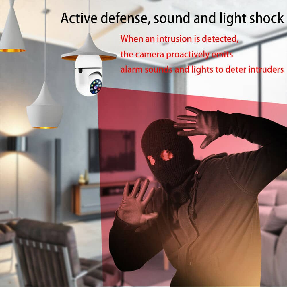 \n\n\nLa lampadina con telecamera di sorveglianza offre una soluzione discreta e versatile per la sicurezza domestica. Con una risoluzione di 1080P, garantisce una visione chiara e dettagliata in qualsiasi momento. La sua caratteristica più distintiva è la visione panoramica a 360 gradi senza zone cieche, controllabile tramite un'applicazione mobile. Grazie alla connessione wireless e alla facilità di installazione utilizzando una base di lampadina standard E27, è possibile configurare e utilizzare la telecamera in pochi minuti.\n