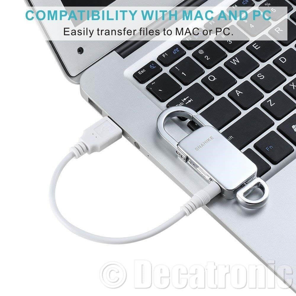 Descrizione\n\nEccezionale qualità di registrazione: il registratore vocale digitale registra a 192 kbps, cattura entro un raggio di circa 6-15 m e cattura bene in condizioni di vento. È possibile ascoltare un audio cristallino utilizzando questo registratore vocale nascosto.\n\nCompatibilità con il software Mac e Windows: può essere scaricato su Mac o PC senza nessun intoppo, grazie alla flash drive da 8 GB sarà facile trasferire i file su Mac o PC.(Nota: gli utenti Mac necessario di VLC media player, che è un download gratuito).\nSemplice e facile da usare: basta accendere il registratore ad attivazione vocale, questo dispositivo di registrazione USB può essere usato come portachiavi, che lo rende prefetto per una registrazione discreta anche nascosto. Ideale per l'ufficio, la scuola, le lezioni e la dettatura personale. Avviso: i tipi di formato sono i file MP3, WMA e WAV.\nRiproduttore MP3 e lungo tempo di registrazione: usato come lettore MP3 e mini registratore vocale, dispone di 8 GB di memoria interna che gli consentono di memorizzare fino a 496 ore di registrazione, supporta 20 ore di registrazione continua.