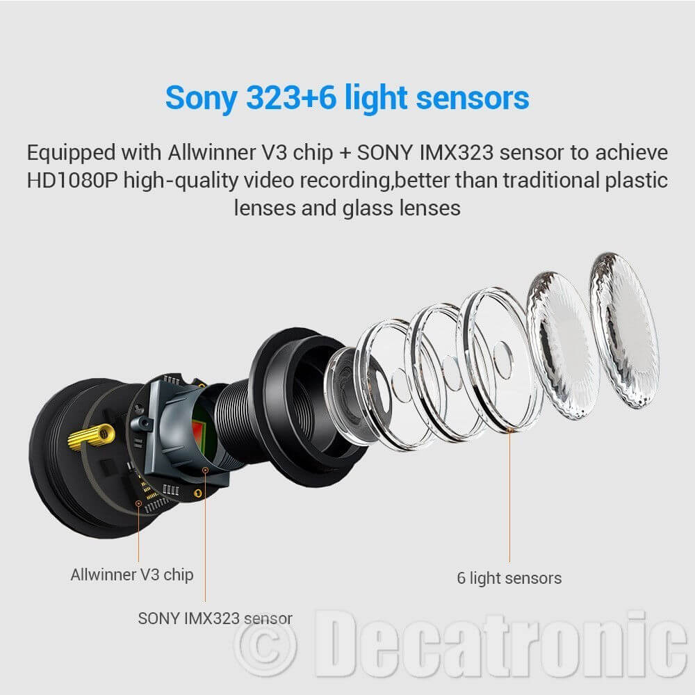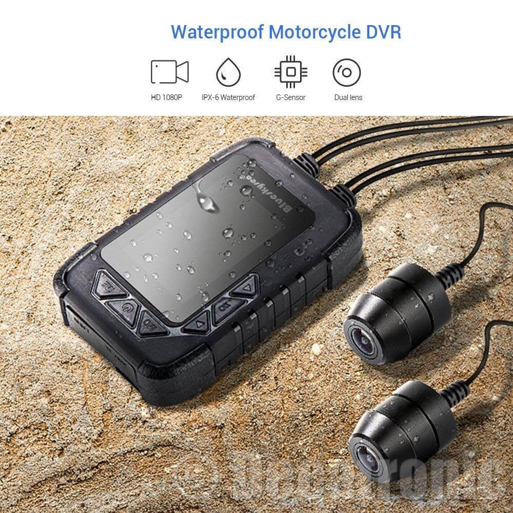 Specifiche prodotto\nProcessor: Allwinner V3\nCMOS Sensor: 2MP Sony IMX323\nLens Optical Parameters: 7G(6G+IR),F1.8,f28mm\nLens Angle: 130 degree\nVideo resolution: 1920x1080P 30fps;1280x720P 30fps\nVideo Codec/Format: H.264/Mp4\nPhoto Resolution: 1/2/5/8MP\nPhoto Format: JPG\nAudio: Mic on wired controller/Speaker on DVR\nMemory card capacity: Up to 128GB Max (not includes in package)\nLoop Recording: 1/3/5/10 minutes\ng-sensor: Off/Low/Middle/High\nEmergency lock: Support\nGPS Logger: Optional\nLanguage: English\nRain Waterproof: IP67 Rated\nScreen Size: 2.4 inch 960x480 dots\nDVR Size: 102x67x25mm/4x2.7x1in\nCamera Size: 28x28x33 mm/11x11x13 in (without Mount)\nCamera Extension Cable Length: 5 m/16 ft(in total)\nWired Controller Length: 2.8m/9ft\nUnit weight: 523g/18.50z\nPower Input: 12-24v\nPower Adapter Output: 5V, 2A\nRemovable lithium battery: 3.7V,500mAh\nStorage Temperature: -4F~+176F(-20°C~+80°C)\nWorking Temperature: 14F~+104F(-10°C~+40°)\n\n\nDescrizione\nPerché la necessità di una dash cam impermeabile? Beh per tutti i motociclisti e gli amanti del motocross, quad e perché no anche fuoristrada. Ovviamente strizza l’occhio anche agli automobilisti classici, autotrasportatori e autisti di bus. \nAl giorno d’oggi avere un dash camera può essere utile in caso di incidente ma anche per riprendere i vostri viaggi e fantastici paesaggi.